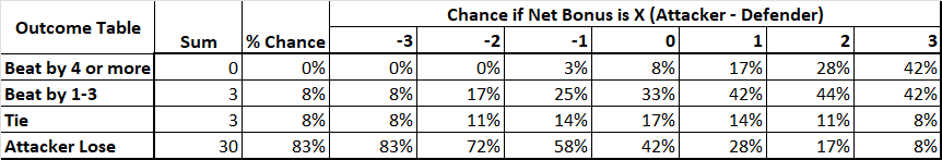 Players each roll 1 dice, add advantages/disadvantages, and then determine the result by subtracting the defender's roll from the attacker's roll.